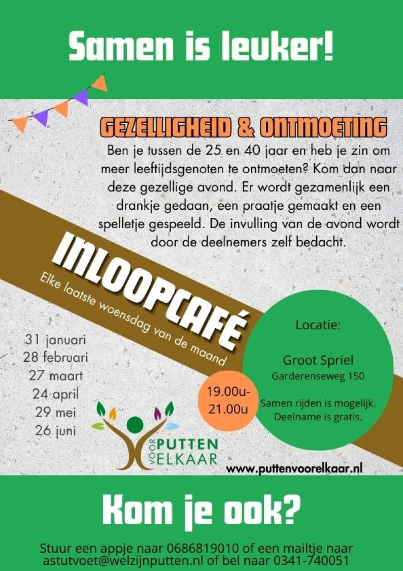 Ben jij tussen de 25 en 40 jaar en heb je zin om meer leeftijdsgenoten te ontmoeten? Putten voor Elkaar organiseert maandelijks een gezellige avond waar mensen elkaar in een ontspannen sfeer kunnen ontmoeten. Er wordt gezamenlijk een drankje gedaan, een praatje gemaakt en een spelletje gespeeld. De invulling van de avond wordt door de deelnemers zelf bedacht. Kom je ook? Stuur een appje naar 06-86819010 of een mailtje naar astutvoet@welzijnputten.nl of bel naar 0341-740051.